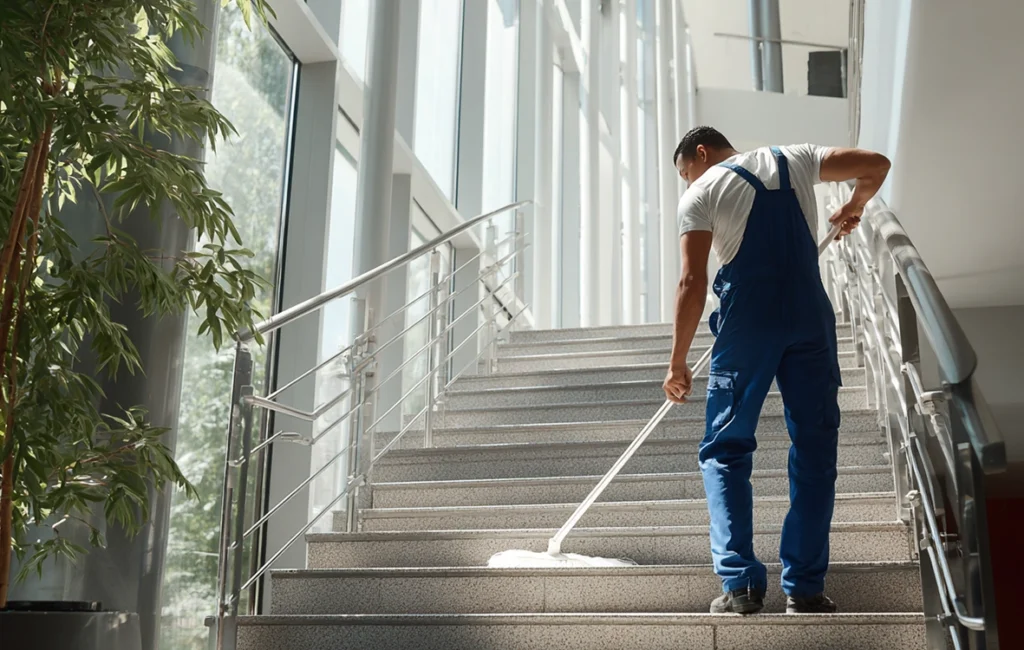 Wir bieten professionelle Treppenhausreinigung für Wohn- und Geschäftsgebäude. Wir reinigen Stufen, Geländer, Böden und Wände, um Gemeinschaftsbereiche sauber und einladend zu halten.